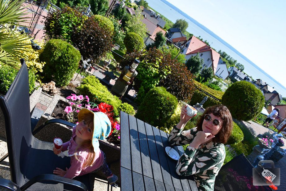 Na mieście jedliśmy lody i piliśmy kawę i jest jedno miejsce, które szczerze mogę polecić – Kawiarnia Pod Globusem. Rozciąga się stamtąd piękny widok na Zalew Wiślany, ogród kawiarni jest bardzo osobliwy (atrakcja sama w sobie), lody są pyszne i wielkie, a i kawa jest niczego sobie.