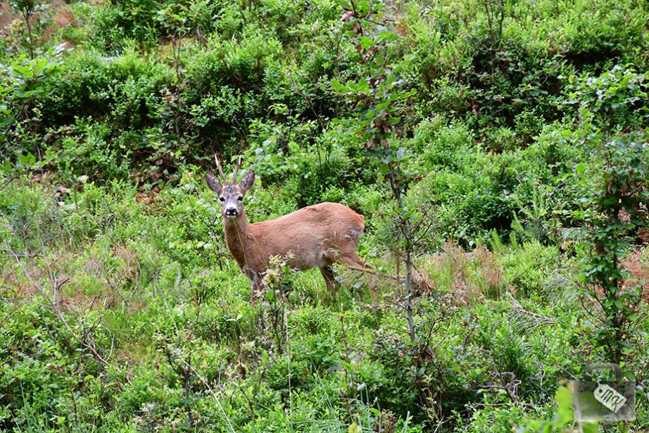 Pogoda była lekko deszczowa, ale w lesie nie bardzo nam to przeszkadzało. Zieleń była bardzo intensywna, a w zaroślach, tuż przy ścieżce, Zojka wypatrzyła sarenkę.