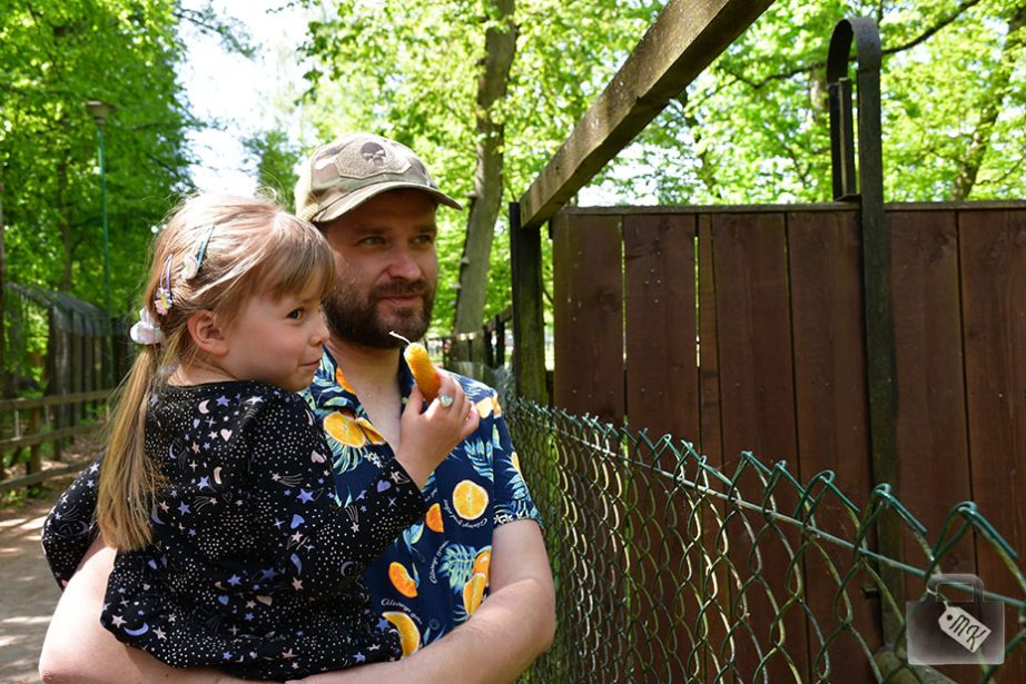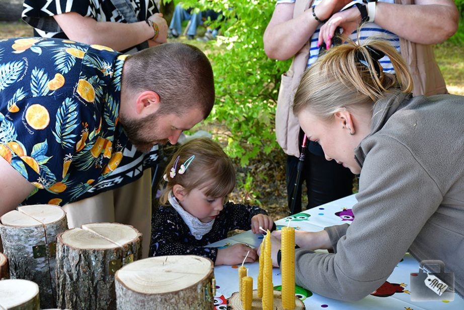 Natomiast tuż po ukończeniu ścieżki, trafiliśmy na placyk przed Rezerwatem Pokazowym Żubrów, gdzie odbywały się różne aktywności dla dzieci. Były układanki, kolorowanki, klocki, a także warsztaty robienia świeczek z plastrów miodu. Zojka sobie taką świeczkę zrolowała i zabrała ze sobą.