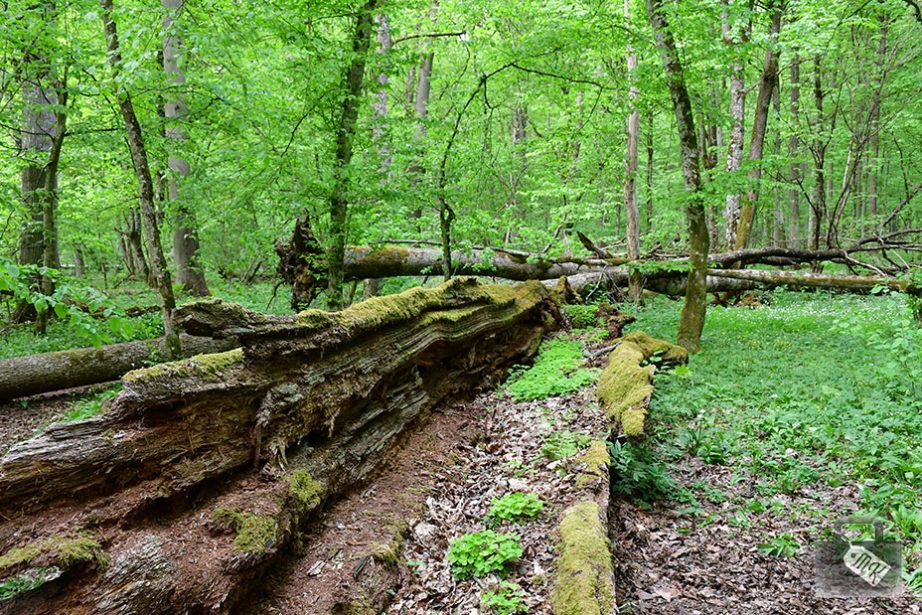 Wszędzie leżą powalone drzewa i faktycznie widać, jak tętni na nich życie. Niektóre są całkowicie porośnięte przez roślinki i widać, że są domem dla małych stworzonek.