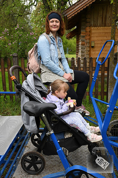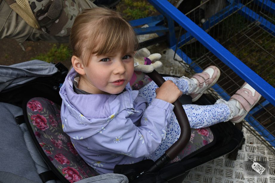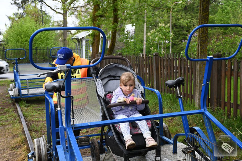 Pedałują dwie osoby, a z tyłu każdej drezyny jest ławeczka, która może pomieścić 2-3 osoby. Jako że my dwoje musieliśmy pedałować, to nie miał kto siedzieć na ławeczce z Zojką i bałam się, że spadnie. W związku z tym, usadowiliśmy ją pomiędzy nami, razem z wózkiem.