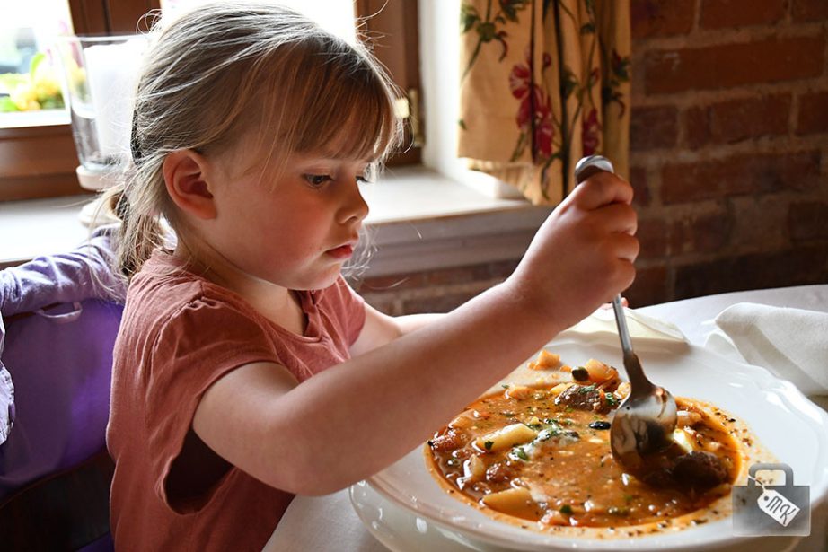 Bardzo fajne miejsce i później zasiedliśmy tam też na kawusię. Kelnerzy byli bardzo mili i w związku z tym, że nie serwowali o tej porze jedzenia, poczęstowali Zojkę rogalikiem ze śniadania hotelowego. Wpuścili nas też do środka, żebyśmy mogli zobaczyć wnętrza i zrobić kilka zdjęć.